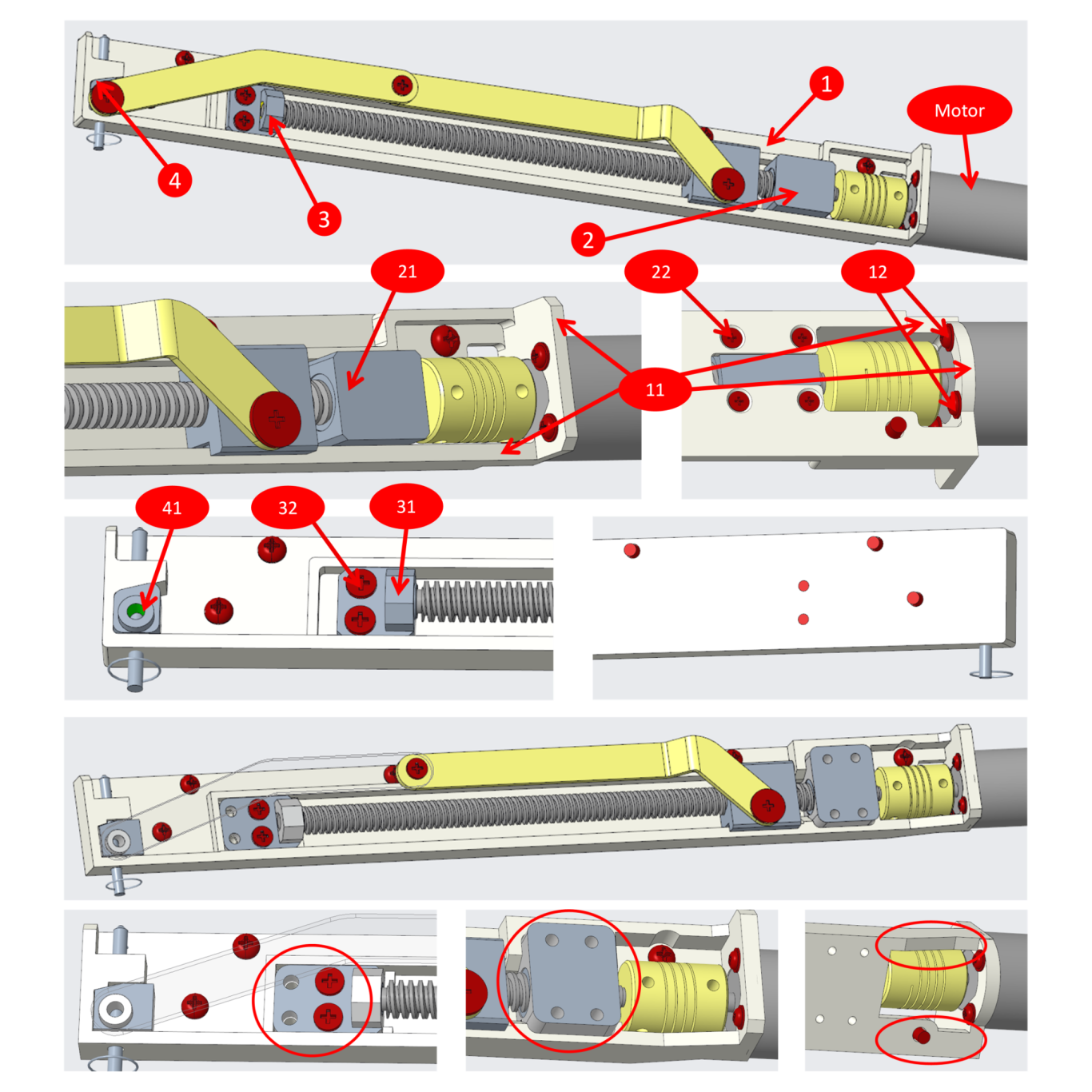 Motor, Halterung (1), Gewindespindel, Lagerblock (2), Einweg-Festlager mit Spindelblock (3), beweglicher Wellenhalter (4, unterhalb des Gestänges), Gestängemechanismus, usw. Die Komponenten 1, 2, 3 und 4 sind Aluminium-Druckgussteile.
